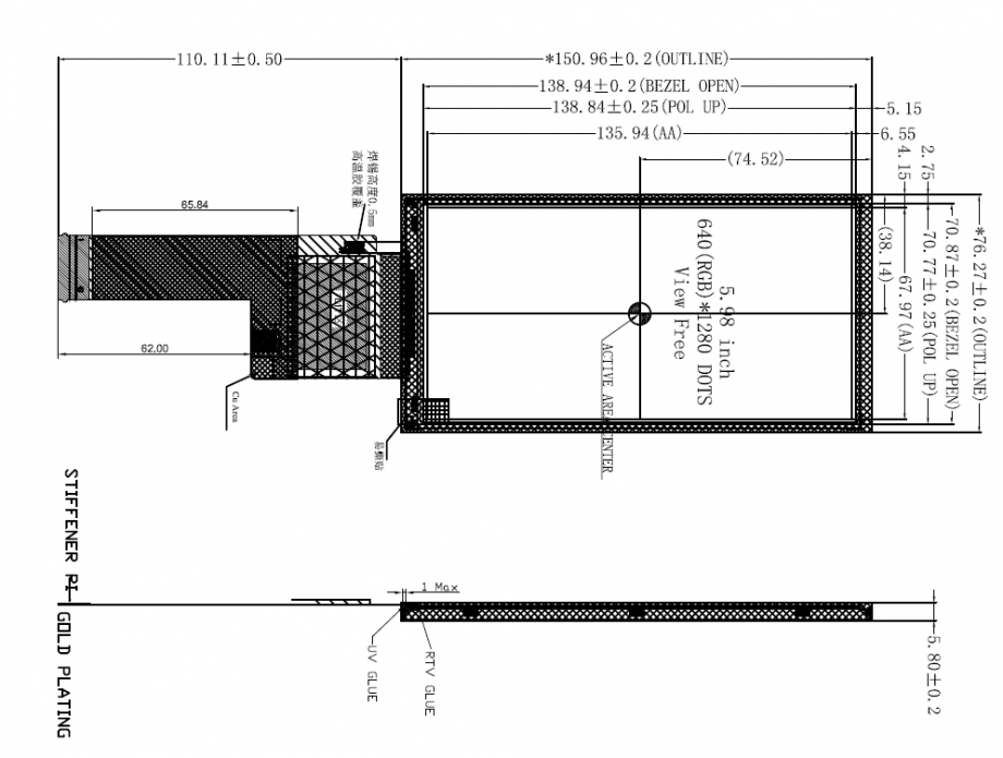 5.92inch, IPS , 640*1280, 1200nits, -30~85, 40P LVDS, WRGB